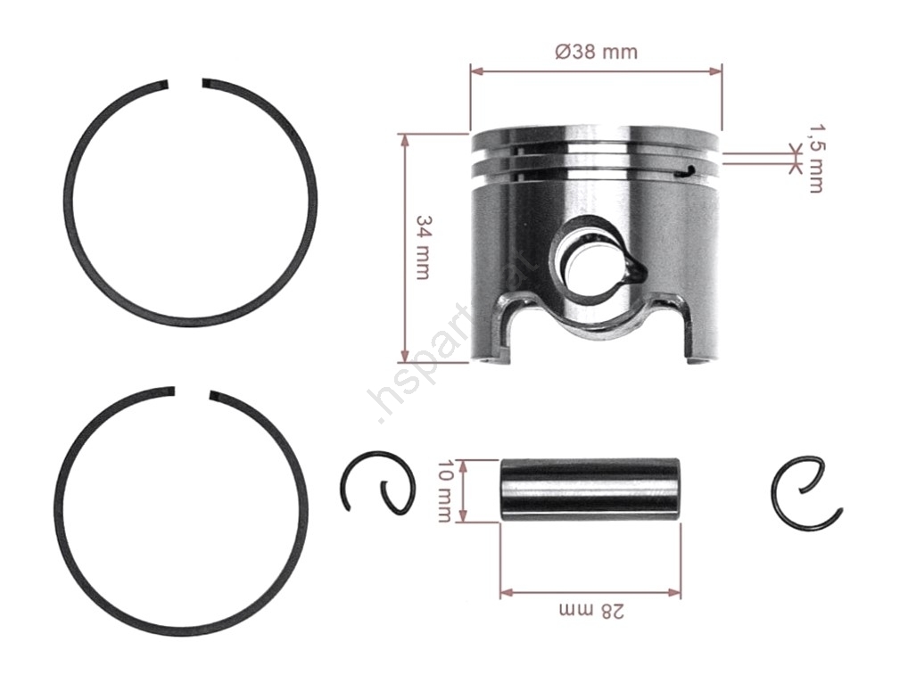 Packungsinhalt: 1x Kolben, 1x Bolzen, 2x Kolbenring, 2x Splint